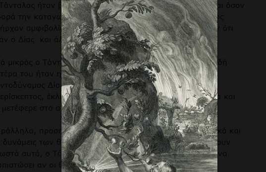 Όταν πεινούσε και άπλωνε το χέρι να φτάσει ένα φρούτο, τα κλαδιά ανέβαιναν σε μεγαλύτερο ύψος και δεν μπορούσε να τα φτάσει. Όταν δε έσκυβε να πιει νερό, αυτό απομακρυνόταν από κοντά του, αφήνοντας τον αιωνίως διψασμένο.