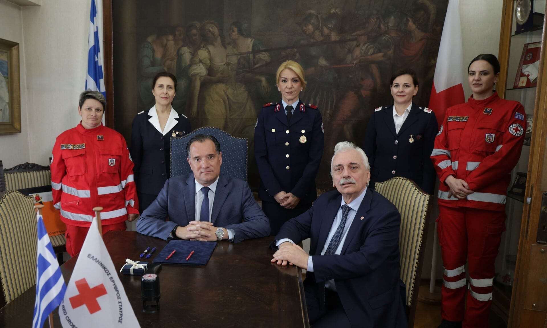 Σττην τελετή, η οποία πραγματοποιήθηκε σε εξαιρετικά εγκάρδιο κλίμα στα κεντρικά γραφεία του Ε.Ε.Σ, ο Υπουργός Υγείας κ. Άδωνις Γεωργιάδης και ο Πρόεδρος του Ελληνικού Ερυθρού Σταυρού, Dr. Αντώνιος Αυγερινός υπέγραψαν το συμφωνηθέν μνημόνιο