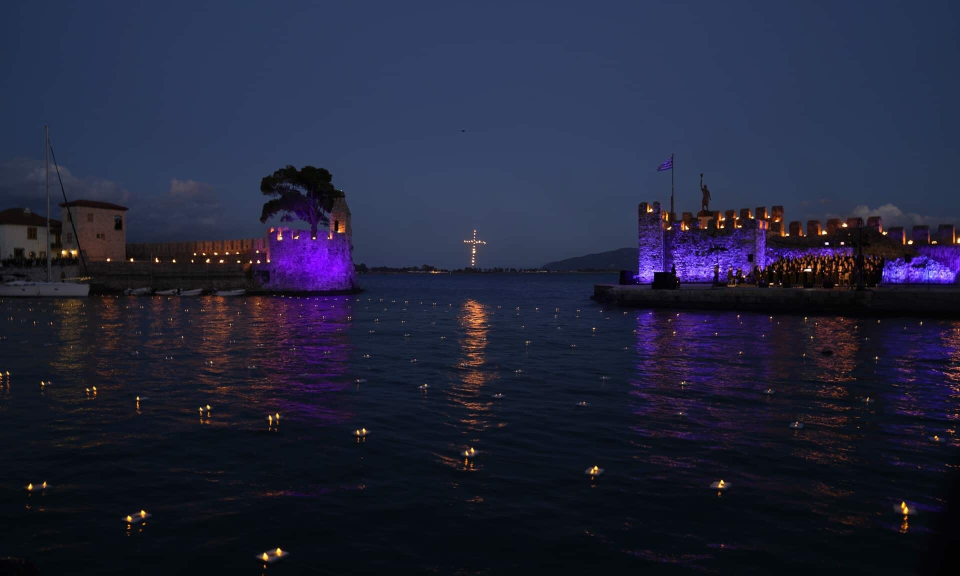 Στην είσοδο του λιμανιού υψώθηκε ένας μεγάλος σταυρός που στολίστηκε με λαμπιόνια, προσθέτοντας την ατμόσφαιρα της εκδήλωσης.