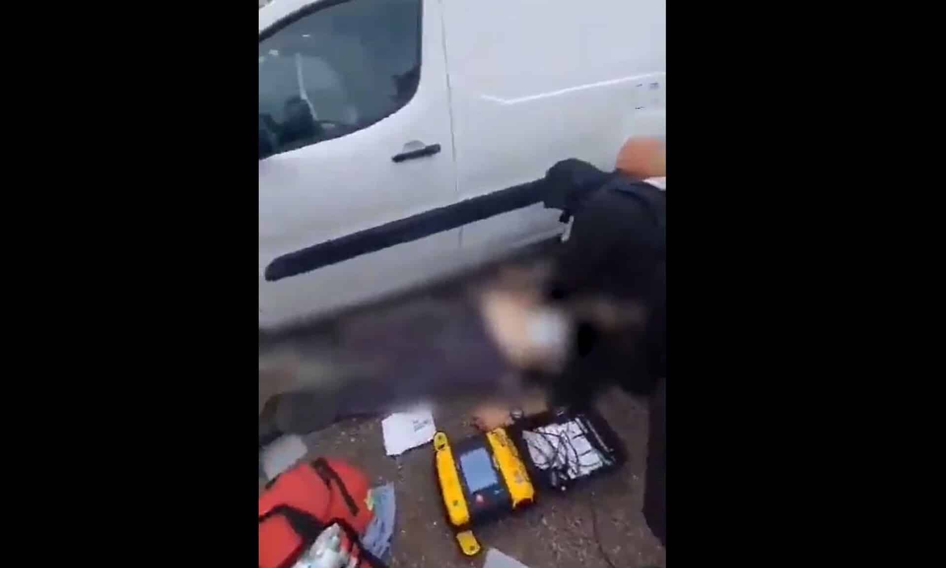 Στο βίντεο φαίνεται ο άντρας να κείτεται αναίσθητος στον δρόμο, ενώ οι δύο αστυνομικοί του παρέχουν τις πρώτες βοήθειες κάνοντας μαλάξεις στο στήθος.