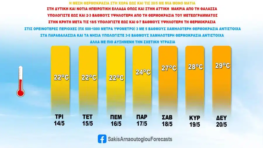 Ο μετεωρολόγος Σάκης Αρναούτογλου ανάρτησε ένα διάγραμμα στο Facebook με τις θερμοκρασίες που θα επικρατήσουν μέχρι και την προσεχή Δευτέρα 20 Μαΐου.