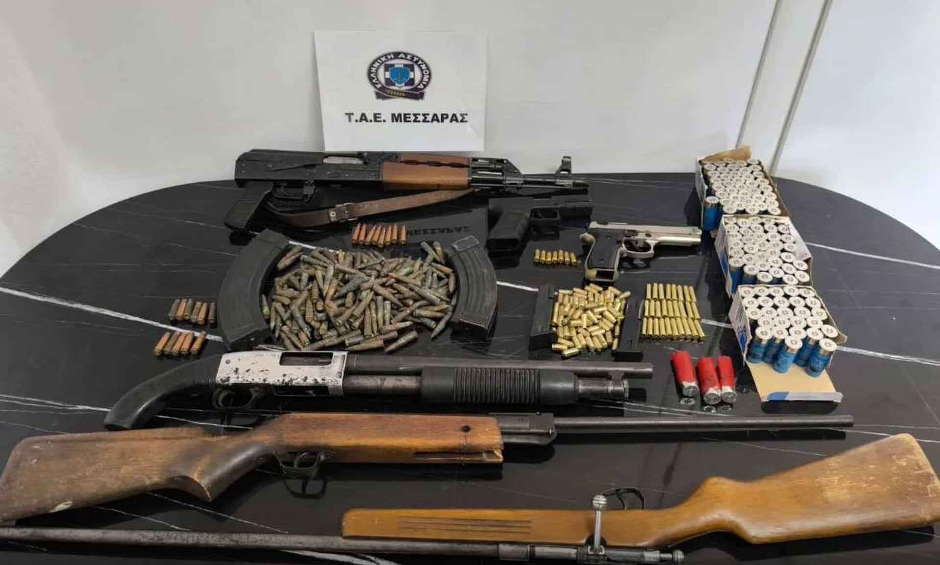Συγκεκριμένα, σήμερα το πρωί 21-5-2024 έγινε έρευνα στην οικία του 25χρονου αλλά και στον περιβάλλοντα χώρο, όπου βρέθηκαν και κατασχέθηκαν ένα πολεμικό όπλο τύπου Kalashnikov, δύο πιστόλια, δύο κυνηγετικά όπλα, ένα αεροβόλο όπλο, τέσσερις γεμιστήρες διαφόρων τύπων, 347 φυσίγγια διαφόρων τύπων και διαμετρημάτων και 83 κάλυκες.