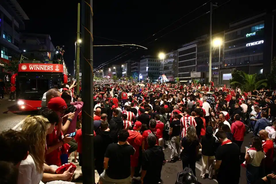 Τα ξημερώματα, το ανοιχτό πούλμαν με τους παίκτες του Ολυμπιακού έφτασε στο Δημοτικό Θέατρο Πειραιά, όπου χιλιάδες φίλαθλοι υποδέχθηκαν και αποθέωσαν τους θριαμβευτές του Conference League.