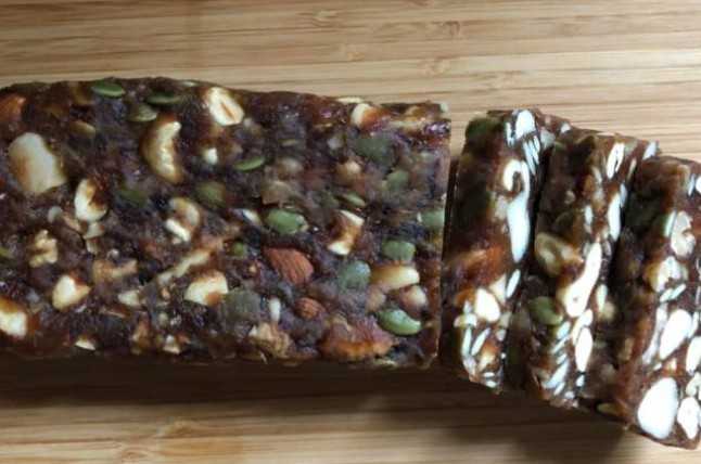 Βγάζουμε τα κουκούτσια απο τους χουρμάδες και τους λιώνουμε σε ένα πολυκοπτικό κουζίνας ή σε ένα γουδί. Θέλουμε να γίνει σαν πάστα. Στην συνέχεια κόβουμε σε χοντρά κομμάτια τους ξηρούς καρπούς και τους αφήνουμε στην άκρη. Βάζουμε το τηγάνι στο μάτι σε χαμηλή θερμοκρασία (στο 3 ή 4) και το αφήνουμε να ζεσταθεί ένα με δύο λεπτά. Στη συνέχεια προσθέτουμε την πάστα από τους χουρμάδες και ανακατέβουμε συνεχώς μέχρι να ζεσταθεί. Ελέγχουμε με το δάκτυλό μας την θερμοκρασία της πάστας (δεν πρέπει να ξεπεράσει την θερμοκρασία του σώματος μας (37 βαθμοί Κελσίου). Μόλις ζεσταθεί το βάζουμε γρήγορα σε ένα μεγάλο μπολ, προσθέτουμε τους ξηρούς καρπούς και το ζυμώνουμε με τα χέρια μας για 1-2 λεπτά μέχρι να γίνει ένα συμπαγές μείγμα. Τέλος το βάζουμε στην φόρμα σιλικόνης και με την βοήθεια ενός κουταλιού το οποίο έχουμε βρέξει πρώτα ισιώνουμε το μείγμα. Βάζουμε στο ψυγείο για 2-3 ώρες μέχρι να σταθεροποιηθεί.