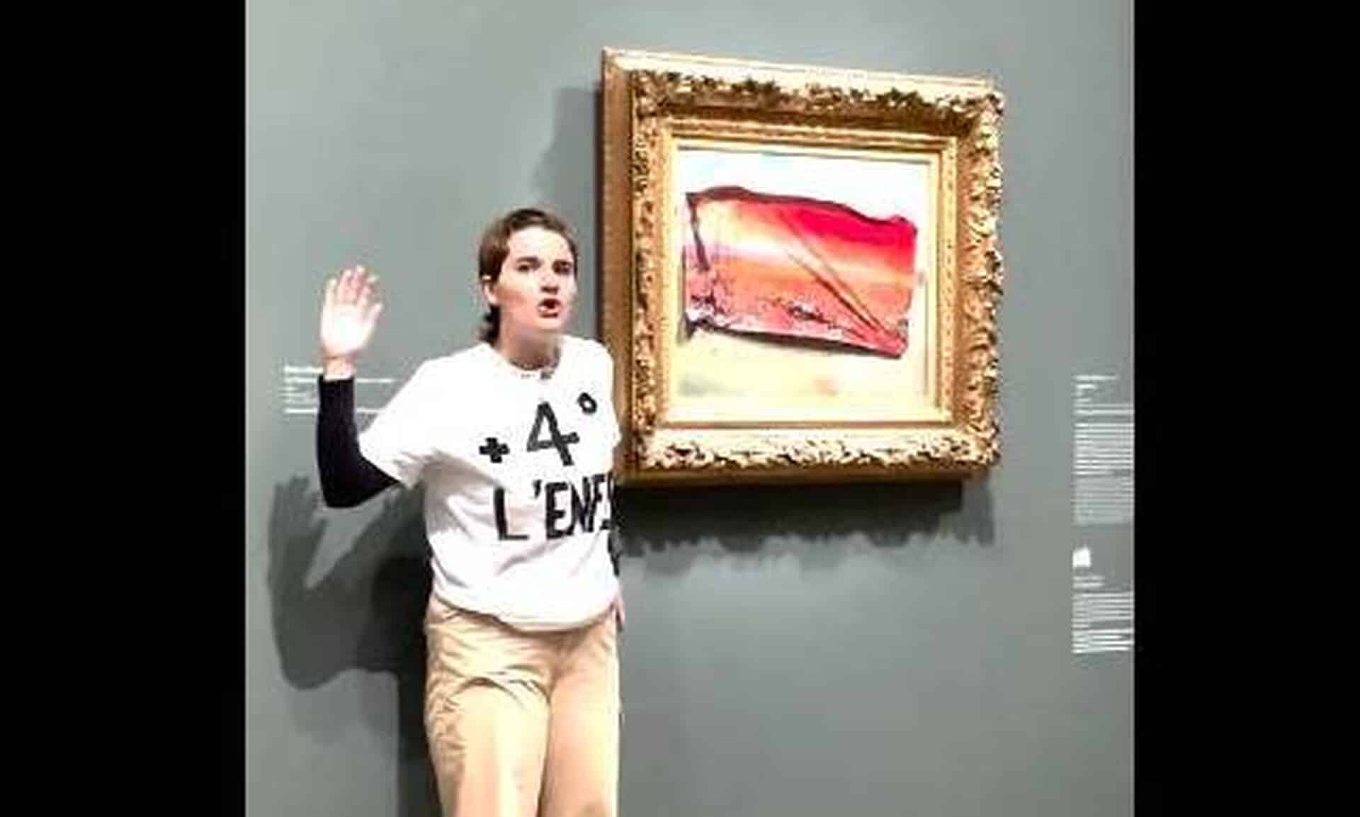Βίντεο της οργάνωσης Riposte alimentaire, που ευθύνεται για σειρά επιθέσεων κατά έργων τέχνης, που αναρτήθηκε στο Χ δείχνει γυναίκα που παρουσιάζεται ως «στρατευμένη πολίτης» να κολλά στον ιμπρεσιονιστικό πίνακα που αποτυπώνει τοπίο με παπαρούνες ένα αυτοκόλλητο πόστερ με εικόνα αποκάλυψης σε κόκκινο χρώμα.