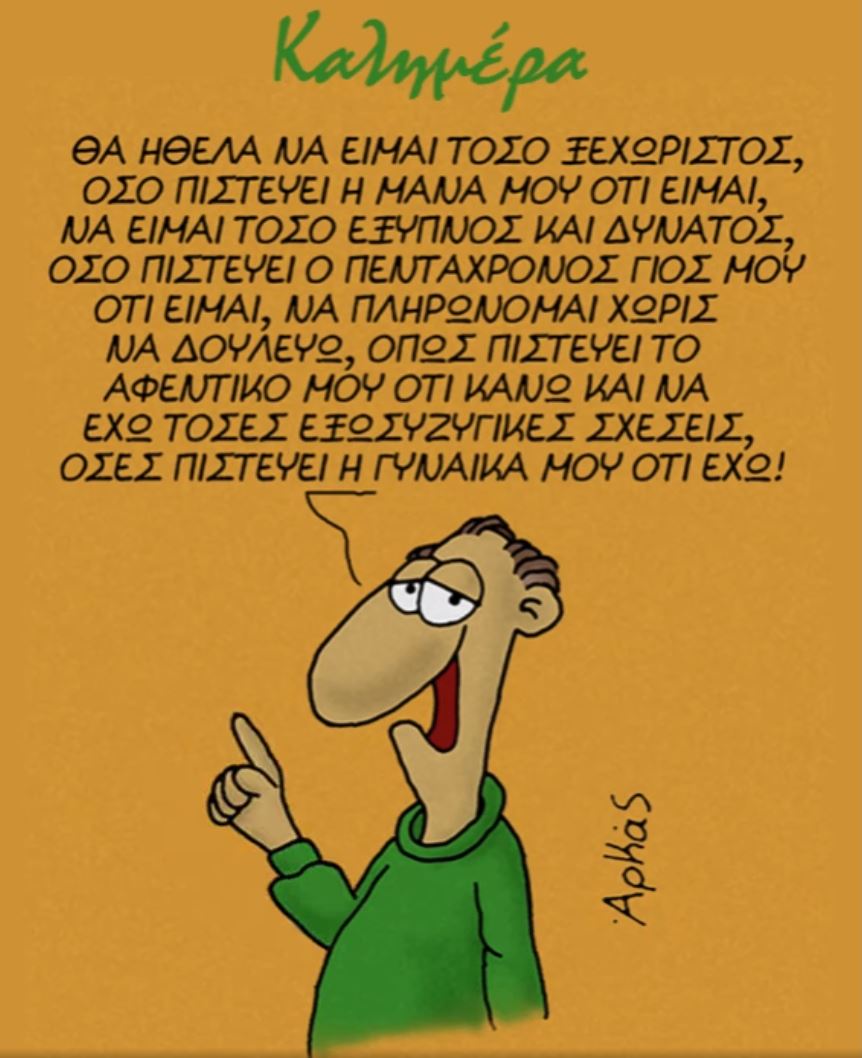 Στο σημερινό του σκίτσο ο Αρκάς κάνει μνεία στην στρεβλή εικόνα του εαυτού μας. Πρωταγωνιστεί ένας άνδρας που φέρει πολλαπλούς ρόλους: γιος, πατέρας, σύζυγος και εργαζόμενος. Ο καθένας από αυτούς τους ρόλους φέρνει μαζί του και μια διαφορετική εικόνα που οι γύρω του έχουν για τον άνδρα αυτόν.