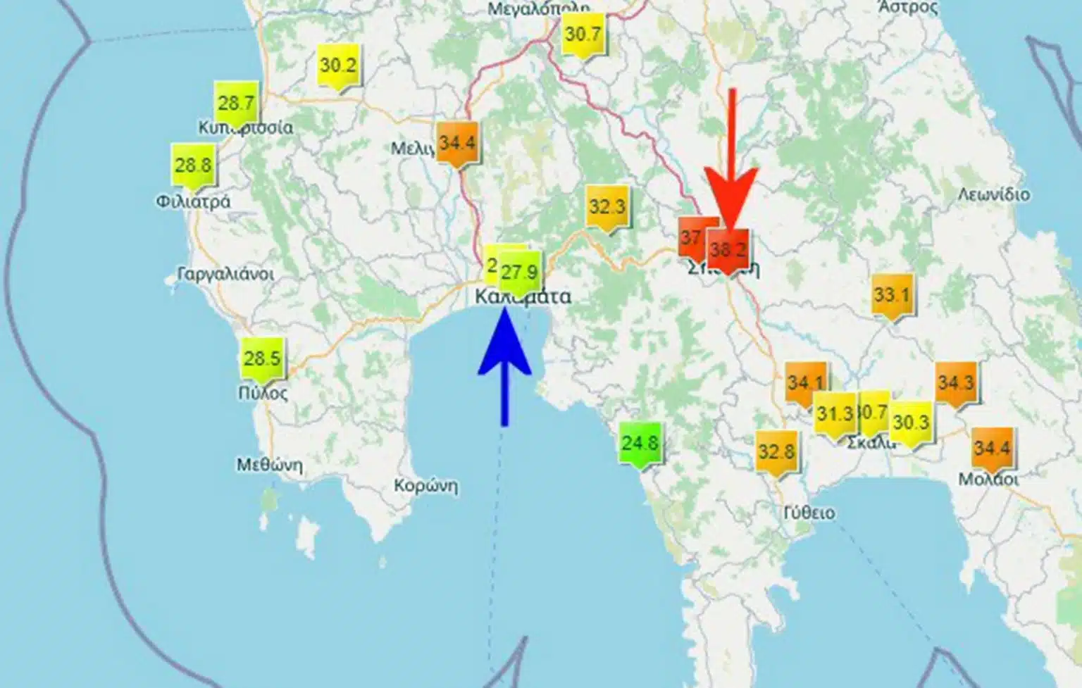 Όπως γράφει ακόμη, «αξίζει να παρατηρήσετε στη δεύτερη κάρτα, πόσο γρήγορα ανέβηκε η θερμοκρασία στη Καλαμάτα ( 37℃), όταν ο άνεμος γύρισε σε ΒΔ!».