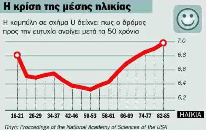 Για την ηλικία, τέλος, µια σειρά από πρόσφατες µελέτες καταλήγουν στο συµπέρασµα ότι η ψυχολογική ευµάρεια είναι µια καµπύλη που έχει το σχήµα του λατινικού γράµµατος U. Ετσι, ο άνθρωπος στα 20 του χρόνια αισθάνεται ψυχολογικά ακµαίος και πιάνει… πάτο στα 46. Ύστερα όµως έρχεται η ευτυχία…