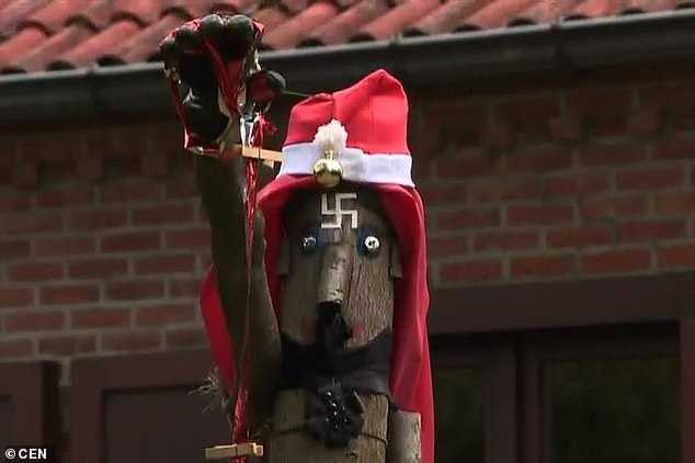 Στο κτίσμα και τον γύρω χώρο φιγουράρουν ναζιστικές σημαίες, εβραϊκά αστέρια, σβάστικες, αετοί, νεκροκεφαλές και αρχικά των SS. Μέχρι και το …σκιάχτρο του χαιρετάει ναζιστικά.