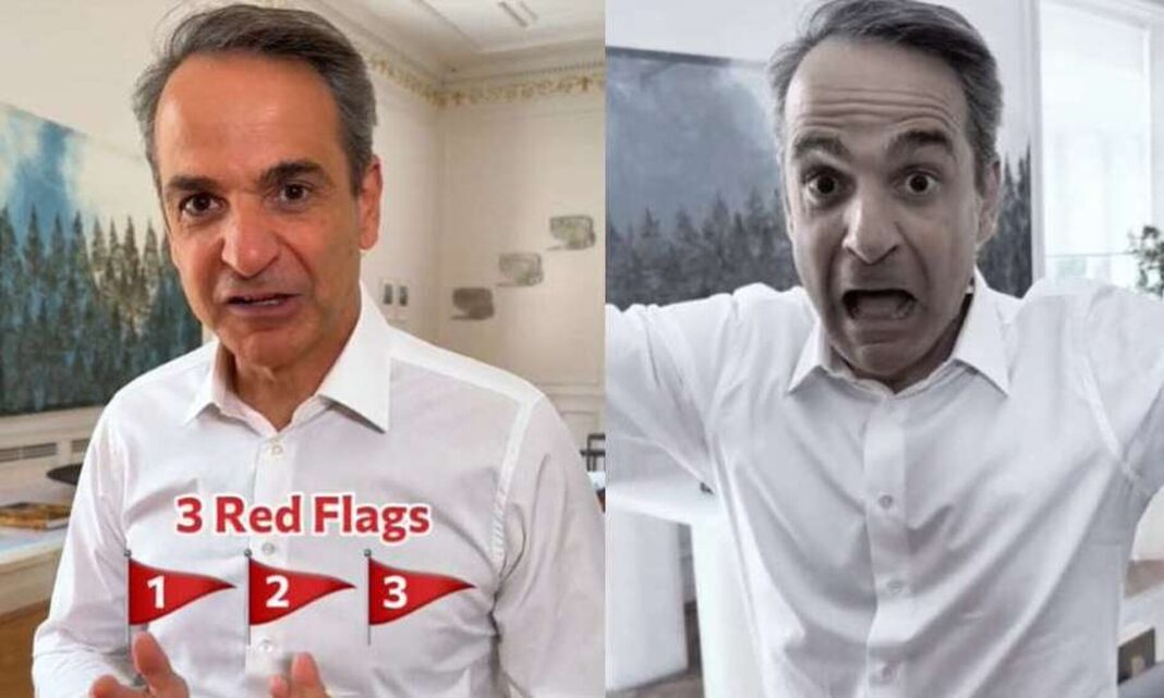 Στην αρχή του βίντεο ο Κυριάκος Μητσοτάκης ακούγεται να λέει: «3 red flags που πρέπει να προσέξετε στο πρώτο ραντεβού» και μια βροχή από καρδούλες αρχίζει να πέφτει.