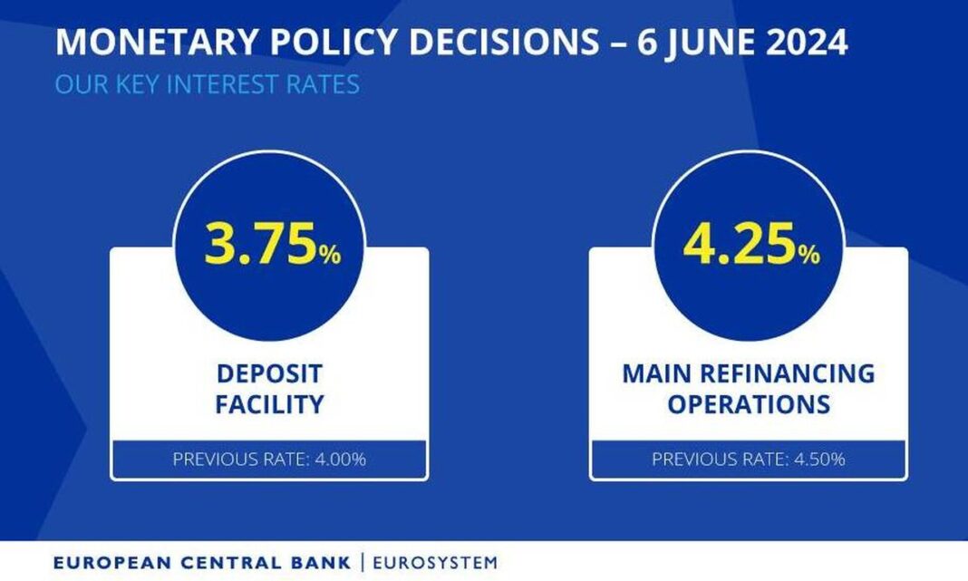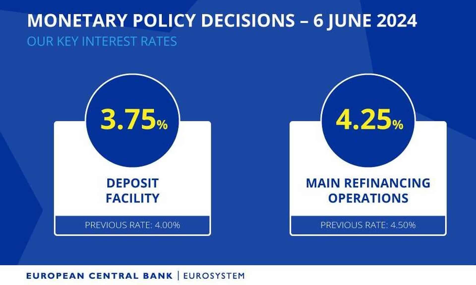 Το Διοικητικό Συμβούλιο αποφάσισε να μειώσει τα τρία βασικά επιτόκια της ΕΚΤ κατά 25 μονάδες βάσης. Κατά συνέπεια, το επιτόκιο των πράξεων κύριας αναχρηματοδότησης καθώς και τα επιτόκια της διευκόλυνσης οριακής χρηματοδότησης και της διευκόλυνσης αποδοχής καταθέσεων θα μειωθούν σε 4,25%, 4,50% και 3,75% αντιστοίχως, με ισχύ από τις 12 Ιουνίου 2024.