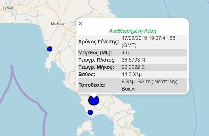 Σύμφωνα με την αυτόματη μέτρηση του Γεωδυναμικού Ινστιτούτου του Εθνικού Αστεροσκοπείου, ο σεισμός είχε μέγεθος 4,6 βαθμών της κλίμακας Ρίχτερ και το επίκεντρο εντοπίστηκε εννέα χιλιόμετρα βορειοδυτικά της Νεάπολης Βοιών Λακωνίας, ενώ το εστιακό βάθος προσδιορίστηκε περίπου στα 14 χιλιόμετρα.