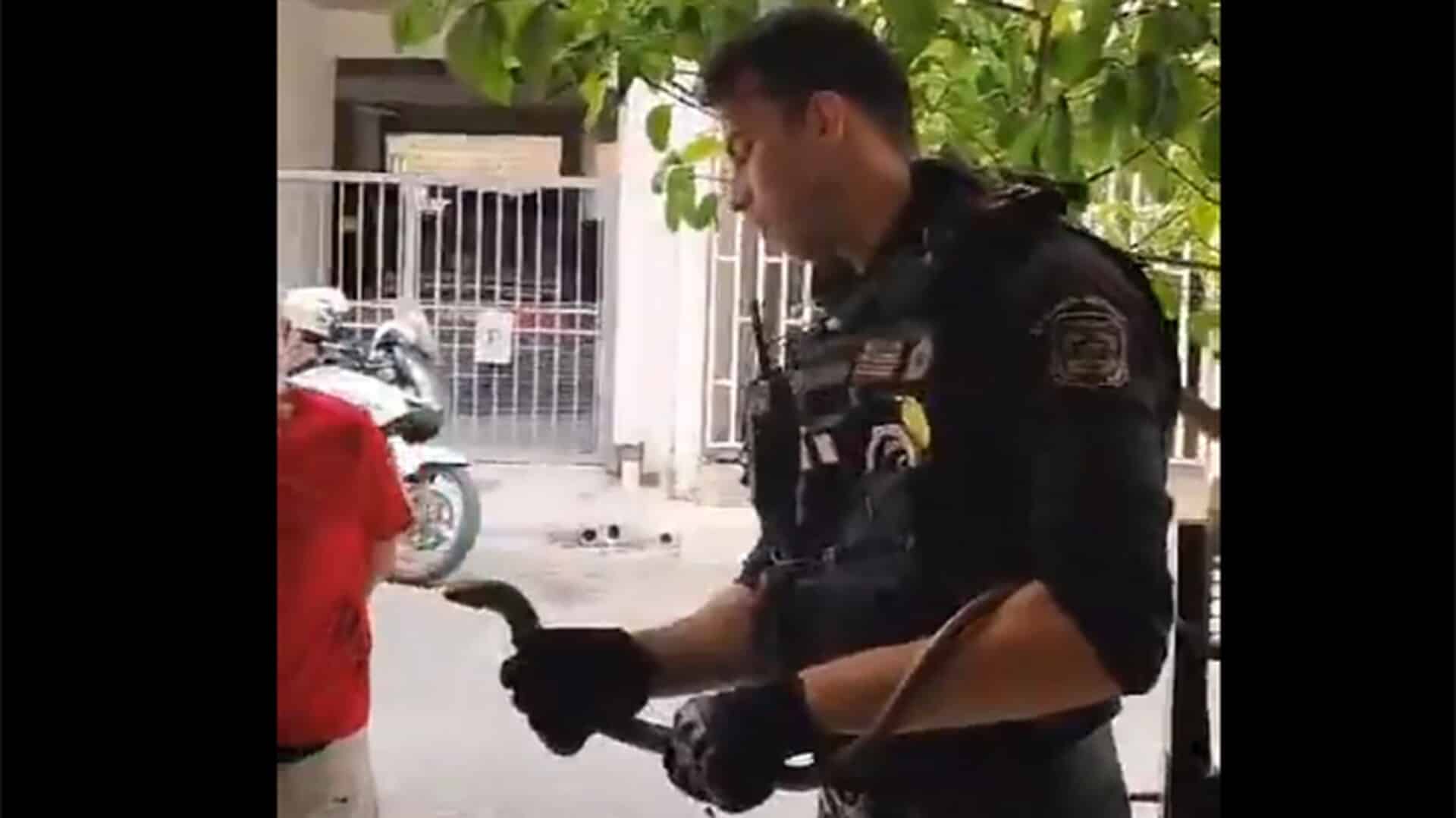 Όπως φαίνεται και στο βίντεο που δημοσιοποίησε η Ελληνική Αστυνομία, οι αστυνομικοί έπιασαν το ερπετό και εξήγησαν στους κατοίκους την διαφορά του φιδιού με την σαύρα.
