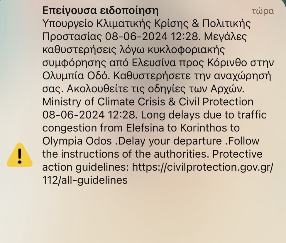 Νέο μήνυμα 112 εστάλη στους κατοίκους της Αττικής και όχι μόνο για μεγάλες καθυστερήσεις λόγω κυκλοφοριακής συμφόρησης από Ελευσίνα προς Κόρινθο στην Ολυμπία Οδό.