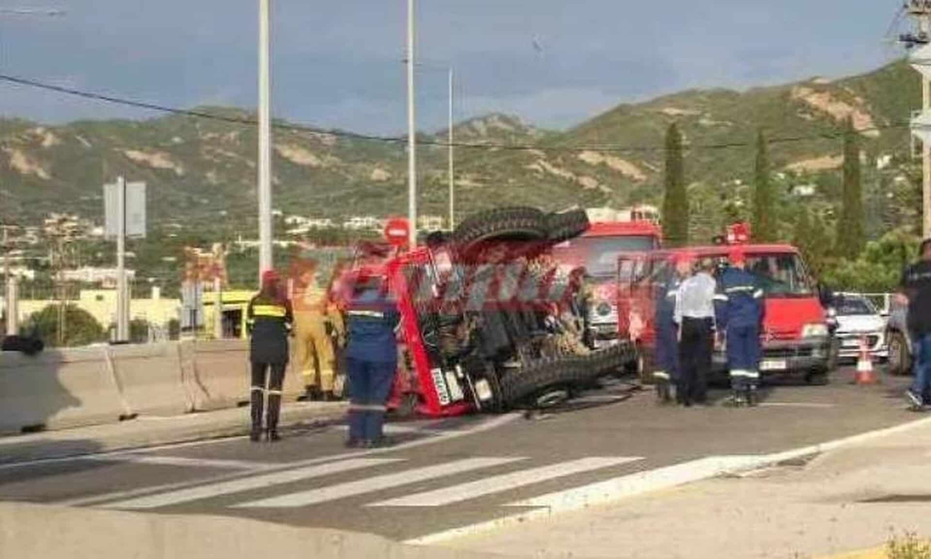 Πυροσβεστικό όχημα ανατράπηκε το απόγευμα του Σαββάτου στον κόμβο του Ρίθου κοντά στο ΠΠΝΠ.