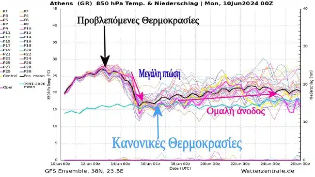 «Στο μετεώγραμμα της Αθήνας παρατηρούμε τη βραχεία διατήρηση της ζέστης την Τετάρτη και Πέμπτη και την σημαντική πτώση του υδραργύρου το Σαββατοκύριακο» κατέληξε ο κ. Κολυδάς για τον καιρό.