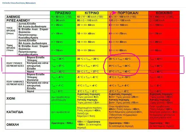 Αρχικά θέλουμε να σας ενημερώσουμε, ότι το μεσημέρι θα εκδοθεί έκτακτο δελτίο επιδείνωσης του καιρού, καθώς θα κινηθούμε έως πορτοκαλί επίπεδο προειδοποίησης, λόγω των θερμοκρασιών που θα επικρατήσουν, με βάση τον χρωματικό κώδικα Meteoalarm της Eumetnet.