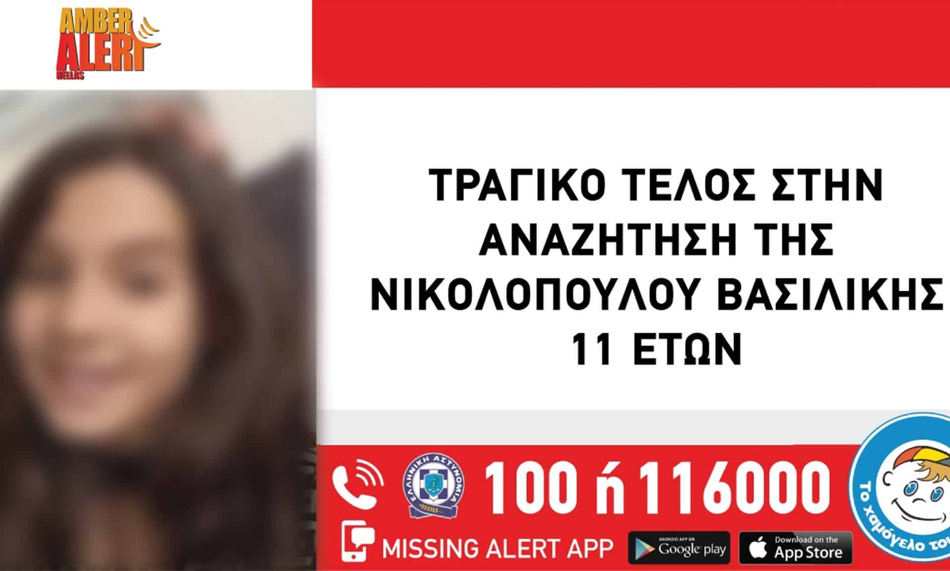 Σύμφωνα με την ανακοίνωσή του, «η αναζήτηση της ανήλικης, Νικολοπούλου Βασιλικής, 11 ετών έληξε με τον πιο τραγικό τρόπο, καθώς ενημερωθήκαμε απογευματινές ώρες ότι η σορός του ανήλικου παιδιού βρέθηκε σε χωράφι, μαχαιρωμένο με τραύματα στο λαιμό. Οι συνθήκες και τα αίτια διερευνώνται από τις Αστυνομικές Αρχές, ενώ έχει προσαχθεί ένας 37χρονος άνδρας ως ύποπτος».