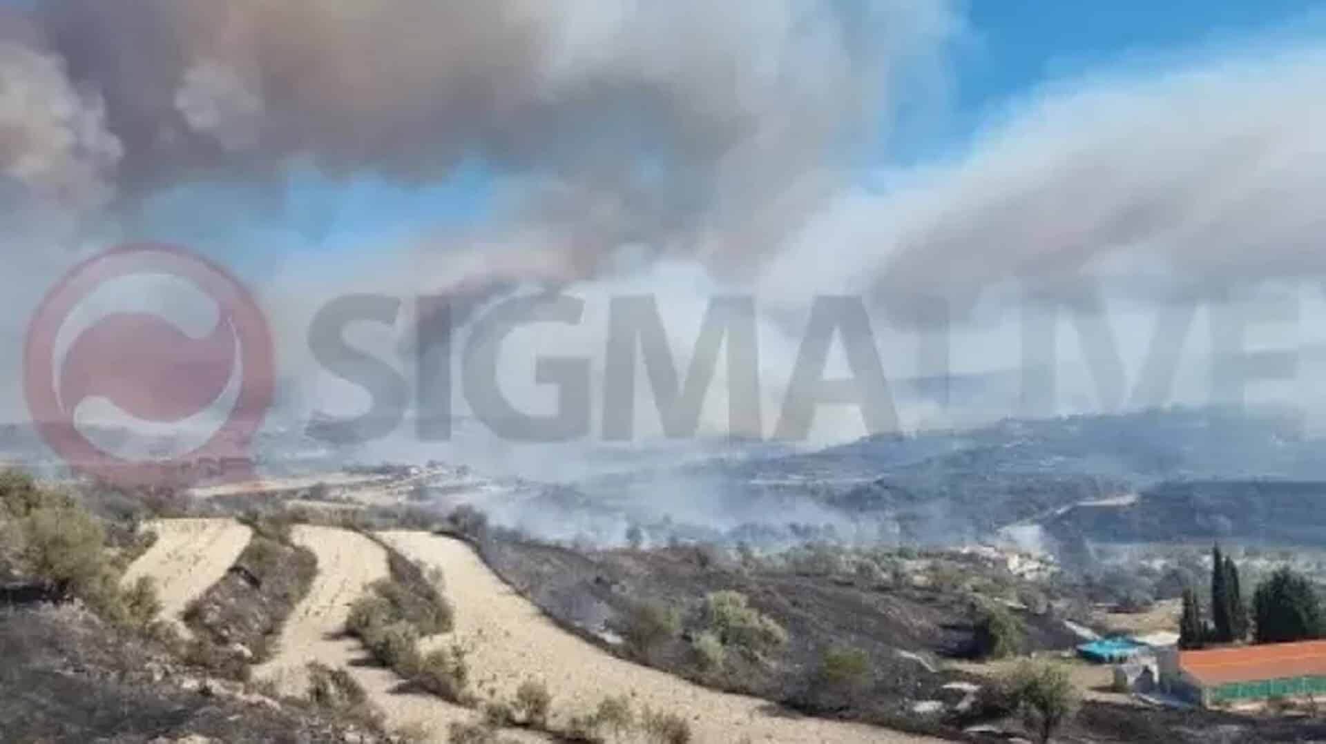 Κύπρος: Από την πυρκαγιά κινδυνεύουν διάσπαρτες μεμονωμένες εξοχικές κατοικίες, ενώ εκκενώθηκε προληπτικά οι κοινότητες Ψάθι, Χούλου και Λεμόνας.