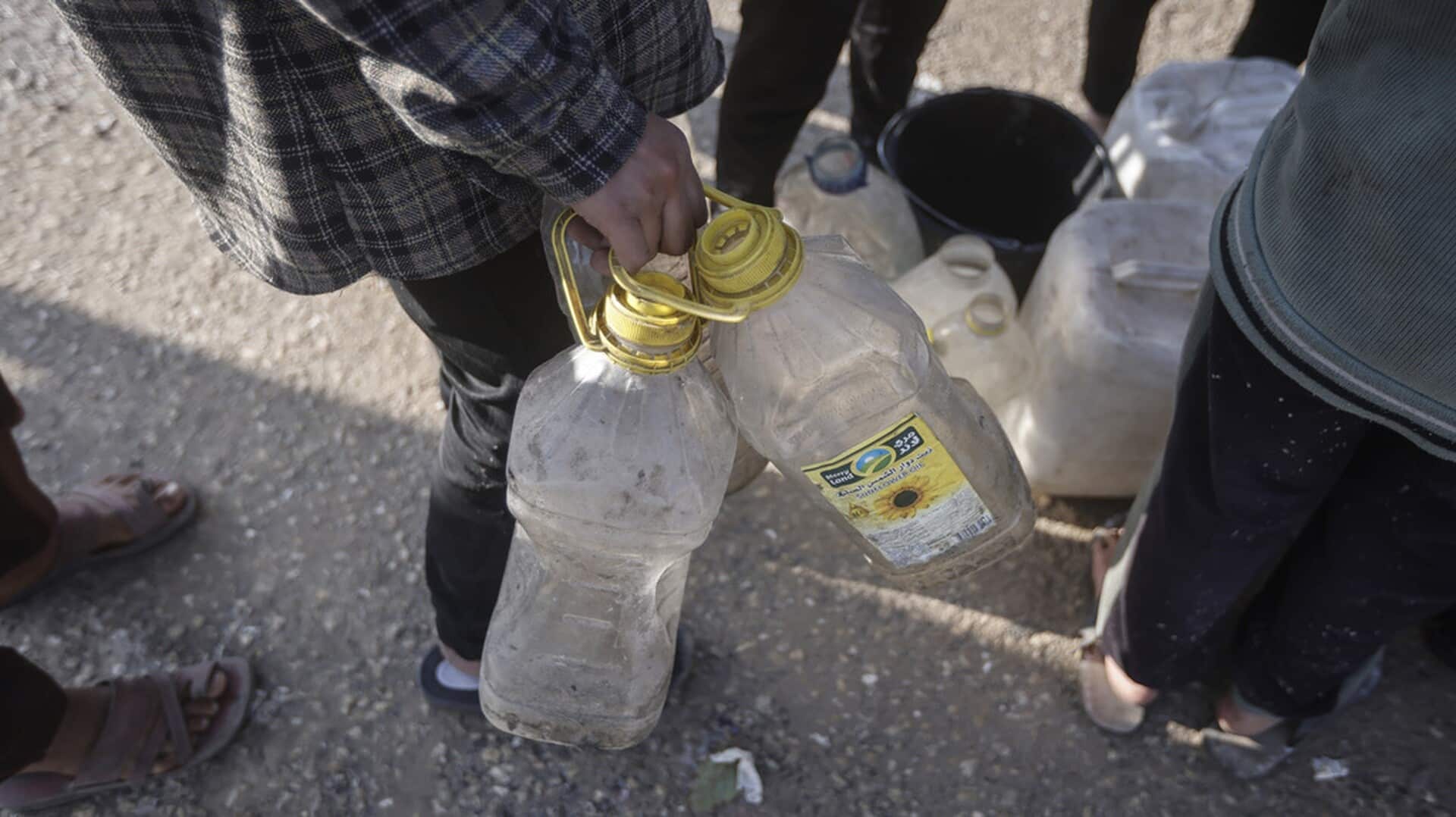 «Όπως βλέπετε, πλένουμε τα παιδιά μας σε μια μικρή λεκάνη. Είναι το νερό από το πλύσιμο των πιάτων, δεν είναι καθαρό, λόγω της έλλειψης νερού», δήλωσε η Φατίμα, η σύζυγος του Άχμεντ. Η ίδια πλένει τον γιο της στο πάτωμα ενός χώρου που είναι ό,τι έχει απομείνει από ένα διαλυμένο σχολείο, το οποίο πλέον αποτελεί το νεότερο σπίτι τους ύστερα από σειρά εκτοπισμών.