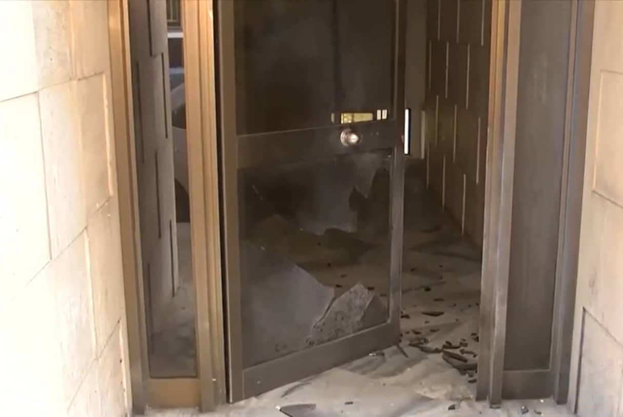 Προκλήθηκαν υλικές ζημιές στην είσοδο, στην πόρτα και στον υαλοπίνακα.