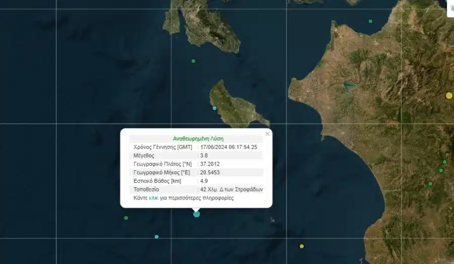 Σεισμική δόνηση μεγέθους 3.8 της κλίμακας Ρίχτερ σημειώθηκε στις 9:17 το πρωί στο Ιόνιο. Ο εν λόγω σεισμός έγινε 42 χλμ δυτικά των Στροφάδων.