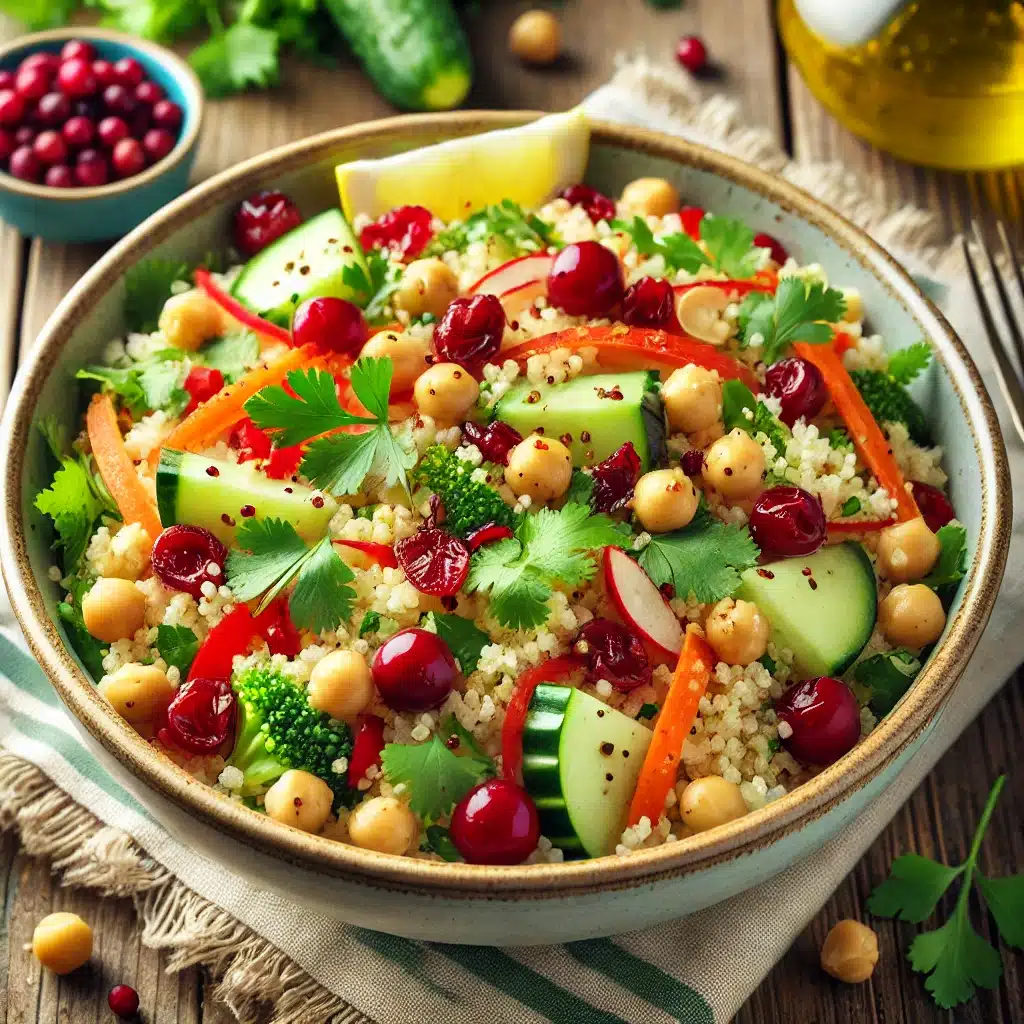 Η καλοκαιρινή σαλάτα με κους κους είναι μια ιδανική επιλογή για ελαφρύ γεύμα κατά τη διάρκεια του καλοκαιριού. Το κους κους, σε συνδυασμό με τα φρέσκα λαχανικά και τα ρεβίθια, δημιουργεί ένα πιάτο πλούσιο σε θρεπτικά συστατικά και γεμάτο γεύση. Η προσθήκη ελαιόλαδου και λεμονιού προσδίδει μια ευχάριστη οξύτητα και φρεσκάδα, κάνοντας τη σαλάτα αυτή απόλυτα αναζωογονητική.