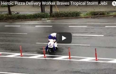 Η κάμερα κατέγραψε έναν πιτσαδόρο να δίνει μάχη με τους σφοδρούς ανέμους, η ταχύτητα των οποίων έφτασε τα 135 χιλιόμετρα την ώρα.