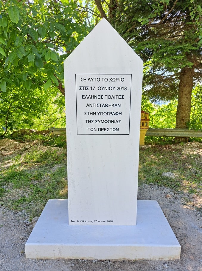 Όσοι υποστηρίζουν ότι δεν είναι νόμιμο να αδειοδοτούνται μνημεία κατά της Συμφωνίας των Πρεσπών απλά λένε ψέματα! Τους διαψεύδει το συγκεκριμένο μαρμάρινο μνημείο που βρίσκεται μπροστά σας και όπως προανέφερα έχει ανεγερθεί νόμιμα. Άλλωστε, ούτε η Συμφωνία των Πρεσπών υποχρεώνει τους πολίτες να την εφαρμόζουν ούτε τους απαγορεύει να αγωνίζονται εναντίον της. Επομένως, εάν έχουμε ακόμα δημοκρατία στη χώρα μας θα πρέπει να μπορούμε να εκφραζόμαστε και εμείς που είμαστε εναντίον αυτής της συμφωνίας, και είμαστε η συντριπτική πλειονότητα, το 70%, όπως φάνηκε από τις δημοσκοπήσεις. Οι Δήμοι και οι Περιφέρειες δεν είναι σωστό να απορρίπτουν τις αιτήσεις ανέγερσης για τέτοια μνημεία. Ή υπάρχει κυρίαρχος λαός που μπορεί να εκφράζει τις ιδέες και τα πιστεύω του ελεύθερα, ή με τρόπο φασιστικό το κράτος ή οι τοπικοί άρχοντες του το απαγορεύουν. Μη μας κουνούν ορισμένοι το δάκτυλο και μας μιλούν για δημοκρατία και ελευθερία ενώ οι ίδιοι τους εμφορούνται από αντιλήψεις αντιδημοκρατικές που στόχο έχουν να περιορίσουν την ελευθερία μας.