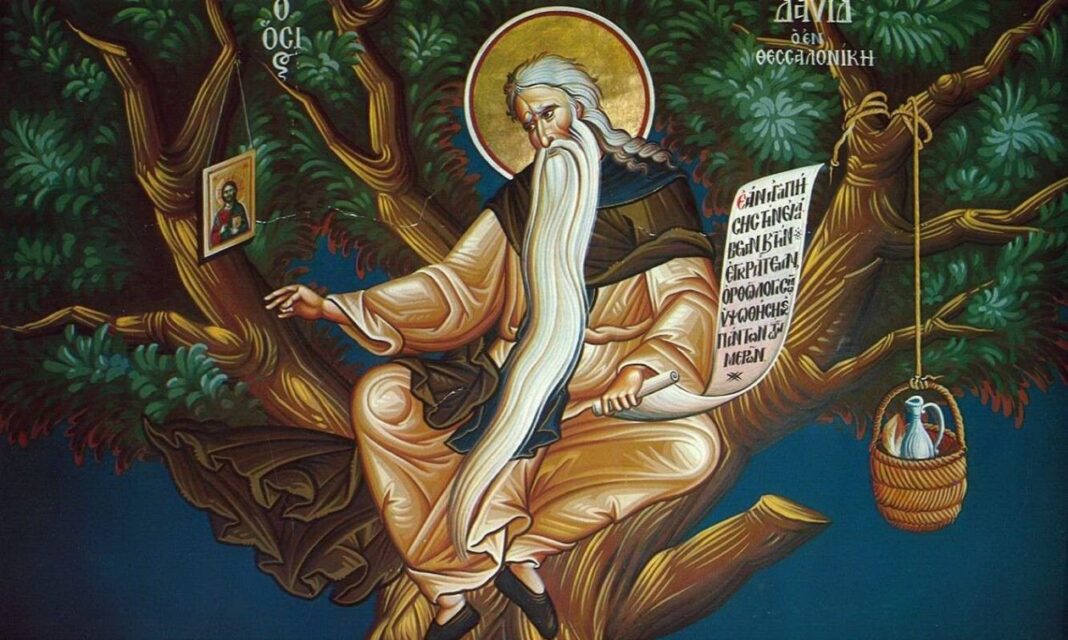 Τη αγάπη του Λόγου πάτερ πτερούμενος, επι του δένδρου διήλθες αγγελικήν βιοτήν, και εξήνεγκας ημίν καρπούς της χάριτος, εξ’ ων τρυφώντες, νοητώς εκβοώμεν σοι πιστώς, Δαυίδ οσίων ακρότης. Μη διαλίπης πρεσβεύων, ελεηθήναι τας ψυχάς ημών.
