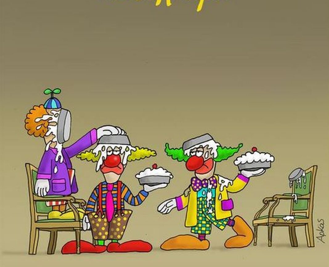 Αρκάς: Στο σημερινό του σκίτσο βλέπουμε τρεις κλόουν σε μια σκηνή που ίσως κρύβει κωμικοτραγικές καταστάσεις. Η λέξη «Καλημέρα» είναι γραμμένη με μεγάλα, κίτρινα γράμματα στο πάνω μέρος της εικόνας. Ειδικότερα οι κλόουν κρατούν τούρτες και ο ένας έχει ήδη λάβει μια τούρτα στο πρόσωπο, υποδηλώνοντας ότι έχουν λάβει μέρος σε ένα παιχνίδι που περιλαμβάνει το πέταγμα τούρτας.