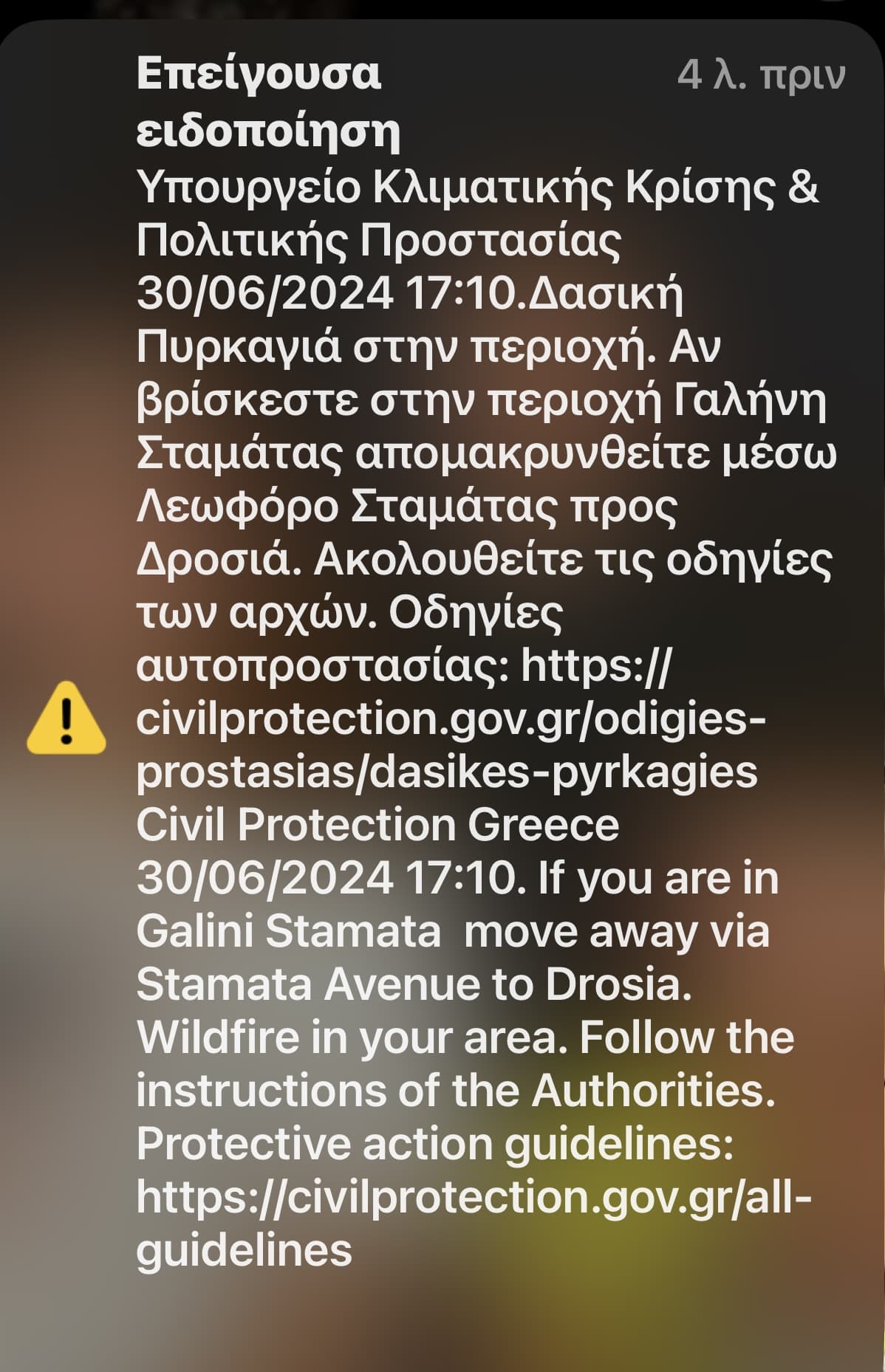 Το πρώτο ενημέρωνε όσους βρίσκονται στην περιοχή Αμυγδαλέζα Δροσιάς να κατευθυνθούν προς την πλ. Σταμάτας, ενώ το δεύτερο ειδοποιεί τους κατοίκους Γαλήνης Σταμάτας να κατευθυνθούν προς την Δροσιά.