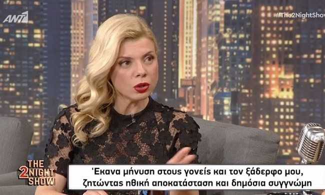 «Έκανα μήνυση στους γονείς και στον ξάδερφό μου, ζητώντας ηθική αποκατάσταση και δημόσια συγγνώμη. Το γεγονός ότι οι μηνύσεις έχουν φτάσει αυτή τη στιγμή στο ακροατήριο, σημαίνει ότι είναι πολύ βάσιμες. Με δύο ένορκες καταθέσεις ότι κάποιος δεν είναι καλά, μπορεί να οδηγηθεί στο ψυχιατρείο. Μάλιστα, η μία από τις δύο καταθέσεις που έγιναν εις βάρος μου, ήταν από έναν ξάδερφό μου από την Πάτρα, ο οποίος είχε να με δει τουλάχιστον 7 χρόνια. Οι γονείς μου κατέθεσαν ψευδώς ότι έχω ιστορικό ψυχιατρικής νόσου και γι΄αυτό διώκονται για ψευδορκία», είπε μεταξύ άλλων η ηθοποιός περιγράφοντας τι ακριβώς έχει συμβεί με τους συγγενείς της και έχουν φτάσει μέχρι τα δικαστήρια.