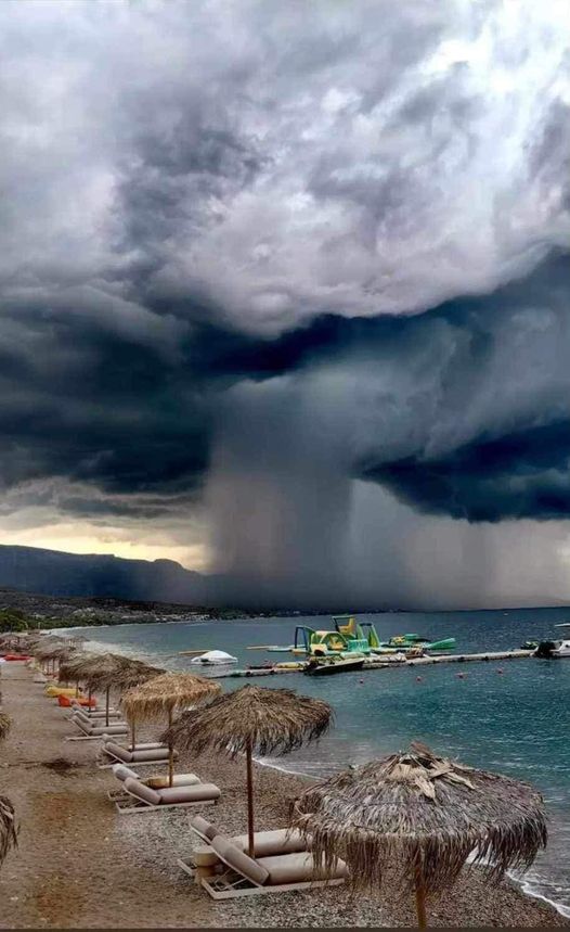 Στη φωτογραφία που δημοσιεύτηκε στη σελίδα «Άγιοι Θεόδωροι / Agioi Theodoroi» φαίνονται τεράστια σύννεφα να έχουν σκεπάσει την παραλία των Αγίων Θεοδώρων σχηματίζοντας έτσι έναν «καταρράκτη» νερού.