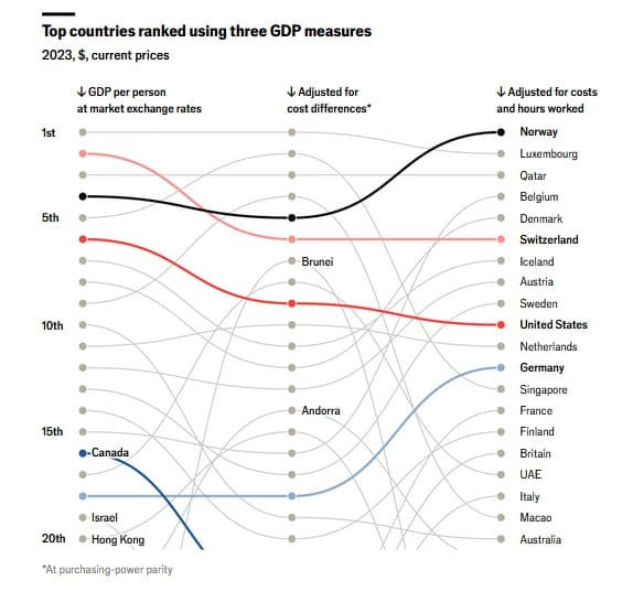 Ο Economist δημοσίευσε την ετήσια κατάταξη των χωρών βάσει της οικονομικής τους ευημερίας για το 2024, χρησιμοποιώντας τρία βασικά μέτρα: κατά κεφαλήν εισόδημα, εισόδημα προσαρμοσμένο στις τοπικές τιμές (ισοτιμία αγοραστικής δύναμης ή PPP) και εισόδημα ανά ώρα εργασίας. Αυτή η προσέγγιση παρέχει μια πιο ολοκληρωμένη εικόνα της οικονομικής κατάστασης κάθε χώρας, λαμβάνοντας υπόψη τις διαφορές στο κόστος ζωής και την παραγωγικότητα.