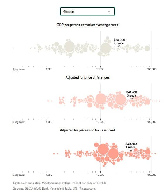 - Η Ελλάδα κατατάσσεται χαμηλότερα όταν υπολογίζονται οι ώρες εργασίας, καθώς οι περιορισμένες ευκαιρίες απασχόλησης και οι υψηλοί φόροι επηρεάζουν την οικονομική απόδοση.