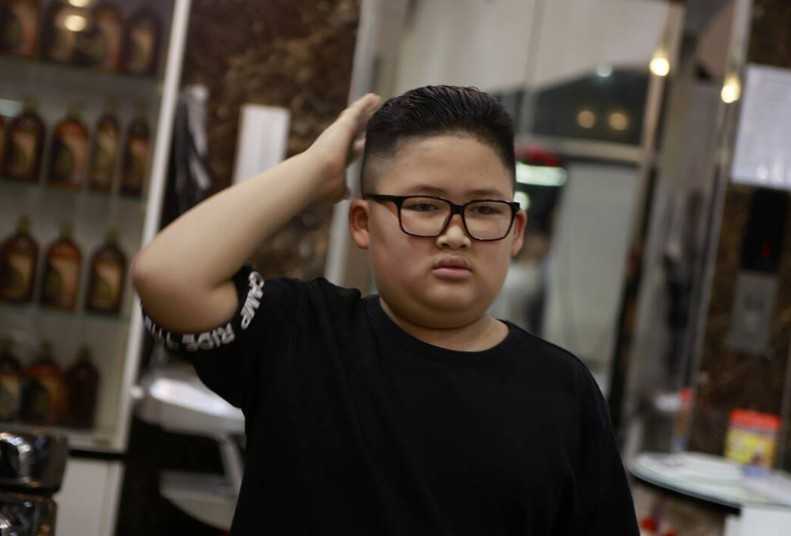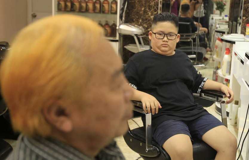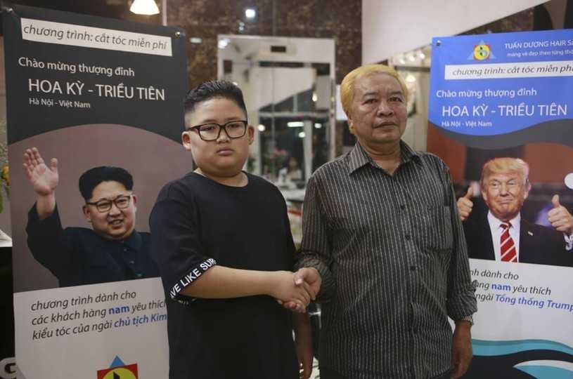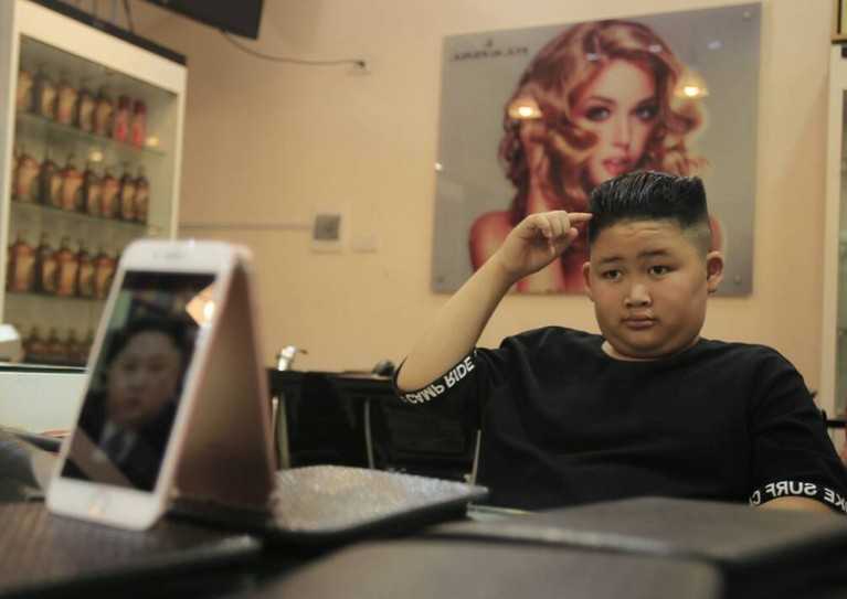 Σε μια καρέκλα δίπλα του, ο 9χρονος To Gia Huy μεταμορφώνεται σε μικρογραφία του ηγέτη της Βόρειας Κορέας, Κιμ Γιονγκ Ουν.