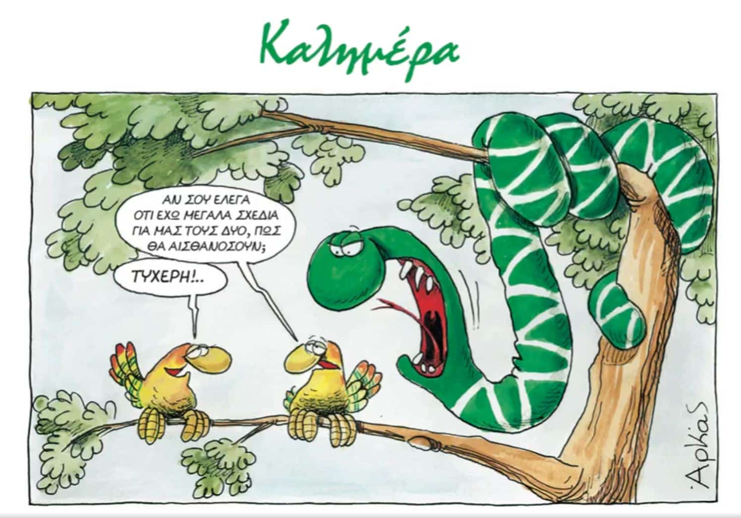 Ο Αρκάς ο αγαπημένος μας σκιτσογράφος, ξεκινάει την ημέρα με μια χιουμοριστική και ταυτόχρονα άξια προβληματισμού «καλημέρα» μέσω του νέου του σκίτσου. Στο σημερινό του σκίτσο, πρωταγωνιστούν δύο σπουργίτια και ένας “κρυφός” θανάσιμος κίνδυνος, σε μια σκηνή που αποκαλύπτει με τον πιο απρόσμενο τρόπο τις ανατροπές της ζωής.