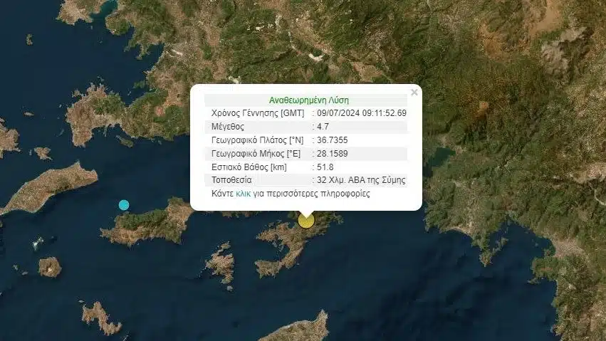 Το εστιακό βάθος του σεισμού στη Ρόδο, υπολογίζεται στα 58,6 χιλιόμετρα ενώ το επίκεντρό του εντοπίζεται 32 χιλιόμετρα βορειοανατολικά της Σύμης.