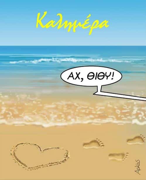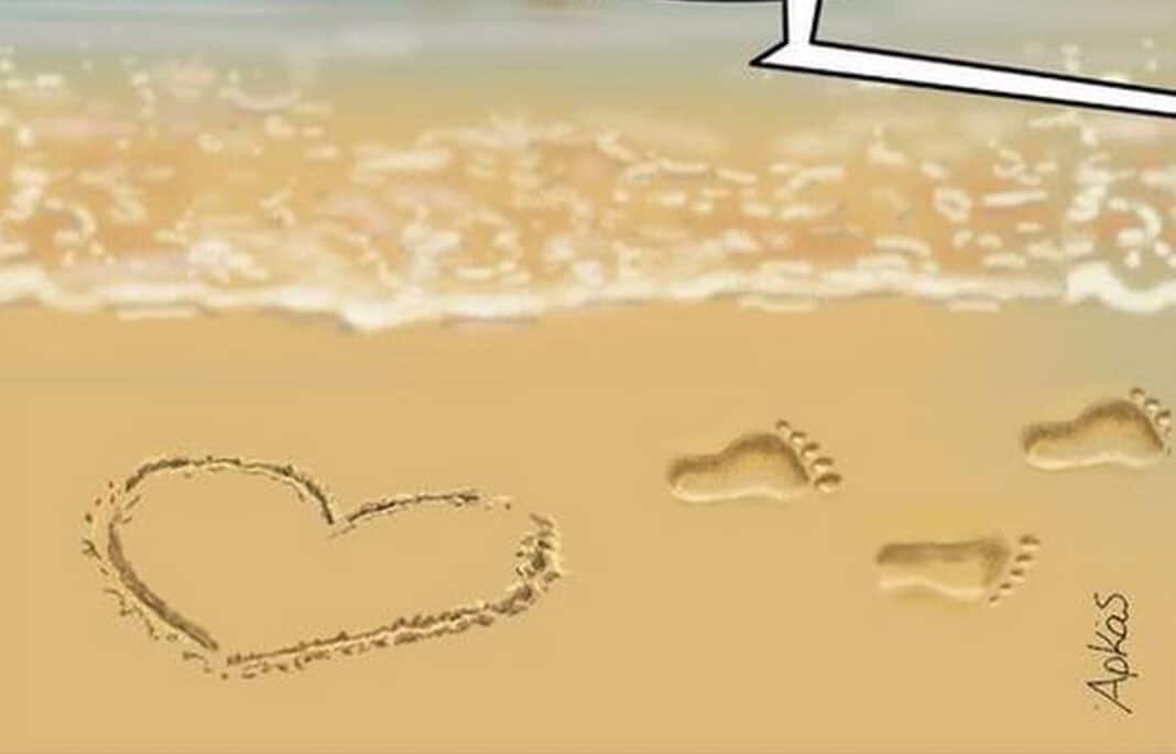Στο σημερινό σκίτσο, ο Αρκάς επιλέγει να διατηρήσει την παρουσία του Θανασάκη, αλλά με έναν αφαιρετικό τρόπο. Αντί να εμφανίζεται ο ίδιος ο Θανασάκης, βλέπουμε τις πατημασιές του στην παραλία και το σύμβολο της καρδιάς που έχει χαράξει στην άμμο. Το σκίτσο συνοδεύεται από τη φράση “ΑΧ, ΘΙΘΥ!” που μονολογεί ο Θανασάκης, προσδίδοντας μια παιδική και αθώα διάσταση.