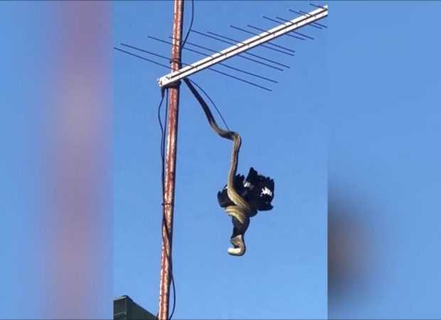 Ένας πύθωνας με μήκος 3 μέτρα «αιχμαλωτίστηκε» από τον φακό να έχει αρπάξει ένα πουλί, ενώ αιωρείται από μια κεραία τηλεόρασης.