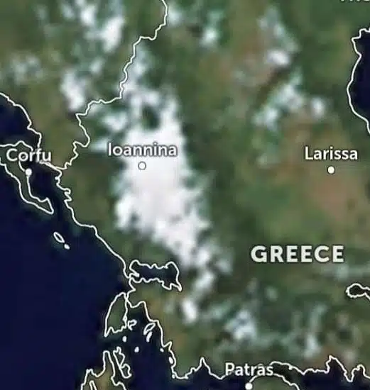 Στις 16:00 η θερμοκρασία ήταν 21ᵒC και η σχετική υγρασία 99%. Πτώση και άνοδος 16ᵒC και 77%, αντίστοιχα, δηλαδή, μέσα σε ένα δίωρο. Η εικόνα από τον μετεωρολογικό δορυφόρο δείχνει τις νεφώσεις στα ορεινά της Ηπείρου που έφεραν τη – μάλλον ευπρόσδεκτη – βροχή.