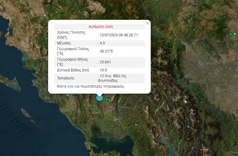 Σεισμός μεγέθους 4 Ρίχτερ σημειώθηκε το πρωί της Παρασκευής (12/7) στην Άρτα. Σύμφωνα με το Γεωδυναμικό Ινστιτούτο, η σεισμική δόνηση είχε επίκεντρο 13 χιλιομέτρων Βόρεια – Βορειοδυτικά της Φιλιππιάδας και εστιακό βάθος δέκα χιλιομέτρων.
