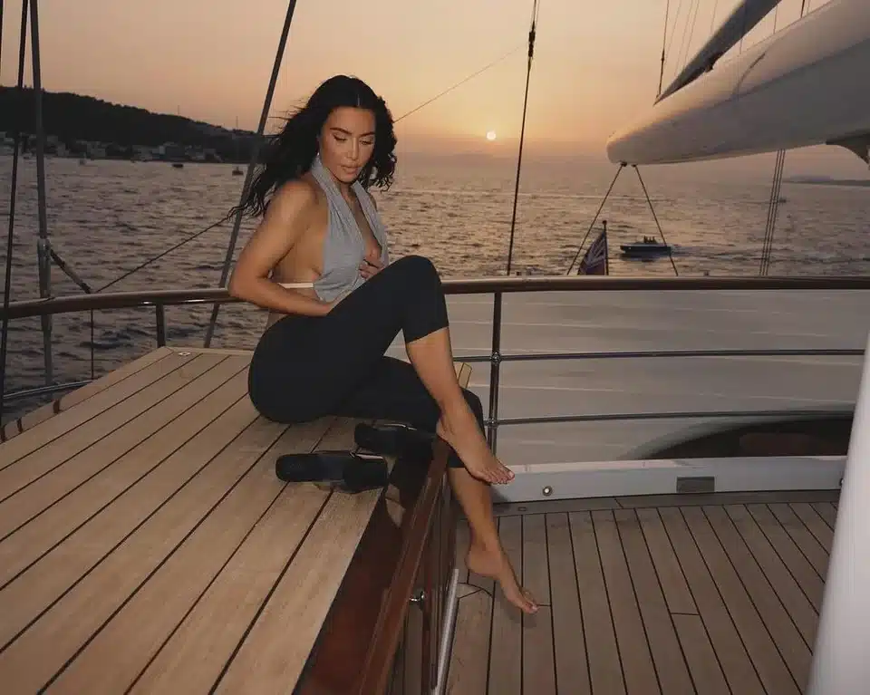 Στις φωτογραφίες που ανέβασε η Κιμ στο Instagram, φαίνεται να ποζάρει πάνω στο σούπερ γιοτ φορώντας ένα μαύρο κάπρι κολάν και μια γκρι αποκαλυπτική μπλούζα, με φόντο τα ελληνικά νησιά και το μαγευτικό ηλιοβασίλεμα. Η λεζάντα της γράφει χαρακτηριστικά: «Σαλπάροντας στο ηλιοβασίλεμα».