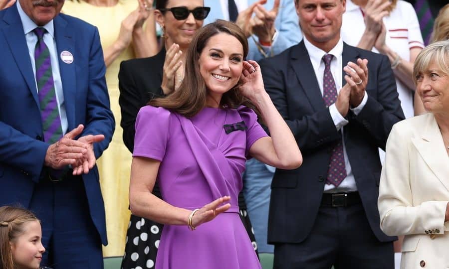 Μαζί με την πριγκίπισσα Σάρλοτ, 9 ετών, και την αδελφή της, Πίπα Μίντλετον, η Κέιτ -η οποία ανακοίνωσε τον Μάρτιο ότι είχε διαγνωστεί με την ασθένεια- ενθουσίασε τους πάντες, σύμφωνα με την Mirror, καθώς χαμογελούσε στους φίλους του τένις ντυμένη με ένα εντυπωσιακό μοβ φόρεμα. Επευφημίες ξέσπασαν για την πριγκίπισσα Κέιτ στο Γουίμπλεντον, καθώς έκανε μόλις τη δεύτερη δημόσια εμφάνισή της μετά τη διάγνωση του καρκίνου της.