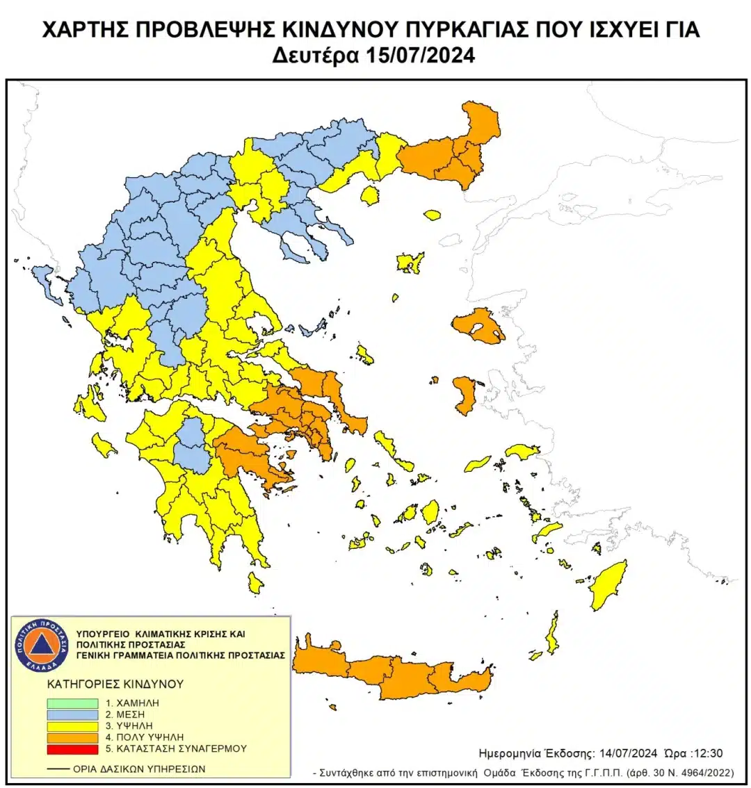 Σύμφωνα με το Χάρτη Πρόβλεψης Κινδύνου Πυρκαγιάς που εκδίδει η Γενική Γραμματεία Πολιτικής Προστασίας του Υπουργείου Κλιματικής Κρίσης & Πολιτικής Προστασίας (civilprotection.gov.gr), για αύριο Τρίτη 16 Ιουλίου 2024, προβλέπεται πολύ υψηλός κίνδυνος πυρκαγιάς (κατηγορία κινδύνου 4) για τις εξής περιοχές: