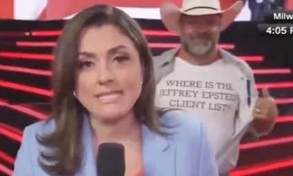 Ένας άνδρας που φορούσε ένα μπλουζάκι που έγραφε «ΠΟΥ ΕΙΝΑΙ Η ΛΙΣΤΑ ΤΩΝ ΠΕΛΑΤΩΝ ΤΟΥ JEFFREY EPSTEIN» … τρολάρισε μια δημοσιογράφο του CNN στο συνέδριο.