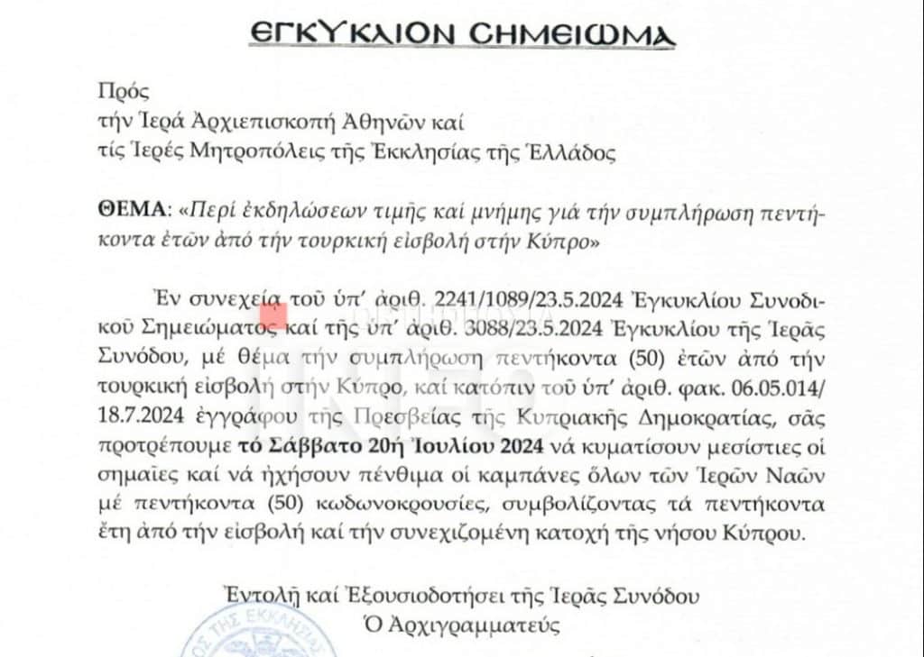 Ὡς ἐκ τούτου, ἡ Ἱερά Σύνοδος τῆς Ἁγιωτάτης Ἐκκλησίας τῆς Ἑλλάδος ἀπεφάσισε νά συμμετάσχει στήν θλιβερή αὐτή ἐπέτειο μέ τήν ἀποστολή τῆς μετά χεῖρας Συνοδικῆς Ἐγκυκλίου, ἡ ὁποία θά ἀναγνωσθεῖ ἀνά τήν ἑλληνική ἐπικράτεια, καί, ἀκολούθως, μέ τήν διοργάνωση διαφόρων ἄλλων ἐκδηλώσεων, ὅπως Ἐπιστημονικοῦ Συνεδρίου γιά τήν χριστιανική παράδοση τῆς Κύπρου καί τήν ἀνείπωτη καταστροφή Ναῶν, Μονῶν καί μνημείων χριστιανικῆς λατρείας, πού προκλήθηκε ἀπό τό μένος τῶν εἰσβολέων.