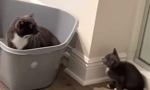 Ο μικρός δεν υποχώρησε, καθώς συνέχισε να κρυφοκοιτάζει στη γωνία το νέο του αδερφάκι, μόνο και μόνο για να του «γαβγίσει» ξανά η μεγαλύτερη γάτα πριν σκύψει στην αμμολεκάνη της.