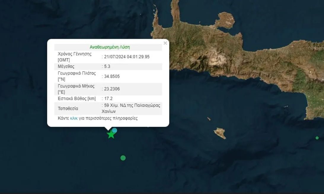 «Σεισμός μεγέθους 5,3 , επιφανειακός , στις 7.01 το πρωί με επίκεντρο 56 χλμ ΝΔ της Παλαιόχωρας Χανίων σε απόσταση ασφαλείας στο θαλάσσιο χώρο. Ακολούθησαν μερικοί μετασεισμοί μικρότερων μεγεθών. Προηγήθηκε προσεισμός 4,2 χθες και άλλοι μικρότεροι. Ακόμη δεν είμαστε βέβαιοι ότι ο 5,3 ήταν ο κύριος», αναφέρει σε ανάρτησή του.